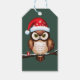 This charming design presents a detailed illustration of a brown and white owl perched on a branch. The owl wears a red Christmas cap with white snowflakes, adding to the festive spirit. His large, captivating eyes attract attention, while a small red gift with a white ribbon subtly lies at the base of the branch, suggesting the generous nature of the holiday season. This design captures the warmth and joy of Christmas by representing this iconic winter bird in a cozy and celebratory setting.