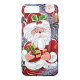 Illustration of a phone case with a cartoon Santa Claus holding gifts, set against a festive background of silver tinsel and another Santa Claus figure. The main Santa is depicted with a large white beard, a red and white hat adorned with holly, and a red suit with white trim. He is holding two wrapped gifts, one green with a red ribbon and the other yellow with a red ribbon. The background features a dense arrangement of silver tinsel, creating a sparkling effect, and a smaller Santa Claus figure is visible in the upper right corner. The style is reminiscent of a glossy, cartoonish design, likely intended for a holiday-themed product.