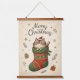 A festive illustration features a cute tabby cat wearing a Santa hat, nestled inside a green and red Christmas stocking. The stocking is decorated with traditional patterns. Above the cat, the words "Merry Christmas" are written in a decorative script. The background is a soft beige color, adorned with stars, dots, and sprigs of greenery.