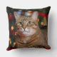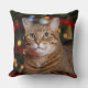 Brown and gray tabby cat posed in front of a lit and decorated Christmas tree