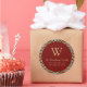 This elegant return address sticker features a burgundy red circle on a background pattern of burgundy, mint green and gold faux foil chevrons. Personalize the design with your monogram initial and family name in gold serif font, with your address below in sans serif.
