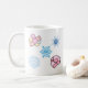 Cute steaming mug of hot cocoa with marshmallows, surrounded by falling