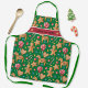 Apron with a festive Christmas cookie and candy pattern on green with red and white contrasts. Changeable text that reads "Christmas Cookies for Santa" can be edited if desired. Choose the color of your ties. Coordinates with a kitchen towel and other designs in the Christmas Kitchen collection at Pinkladybugs on Zazzle.