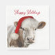 Cute watercolor cow wearing a Santa Claus hat on white with Happy Holidays text.