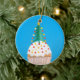 A Christmas Ornament with a cupcake on each side. The white frosting is topped with a decorated Christmas Tree and is from a handpainted paper collage design by Judy Adamson. Coffee mugs and Christmas cards with this design also available.