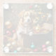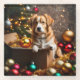 A brown and white Border Collie sits in a cardboard box overflowing with gold tinsel and colorful Christmas baubles. The dog is the focal point of the image, looking directly at the camera with a calm expression. It is surrounded by festive decorations, with a sparkling Christmas tree in the background. The warm lighting and cozy atmosphere enhance the holiday theme of the picture.
