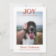 Elegant happy holiday Christmas card to the "two leggeds" from the canine adventure dog walkers, featuring a smiling dog photo and the heading reads : JOY. From the dogs!