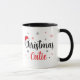 Modern and cute Christmas Cutie mug. "Christmas Cutie" is in a lovely red and black modern script typography with a Santa's hat hanging on the "Ch" of Christmas. Surrounded by charming snowflakes. Sip something warm while wearing our matching t-shirt or apron!