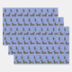 This fun and festive wrapping paper comes in separate sheets. Each sheet shows the same repeating patter of cute, cartoon dachshunds wearing a green scarf and reindeer antlers against a snowy, blue background. A great gift wrap design for any dog lover or dachshund owner.