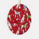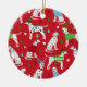 Cute Christmas dogs in festive holiday outfits. Dalmatian with black and white coats wear Santa hats, antlers, sweaters on a holiday background with scattered ornaments.