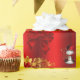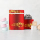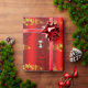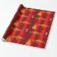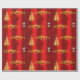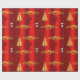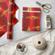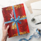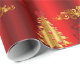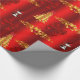 A whimsical, red Christmas wrapper featuring a golden pattern of Christmas trees, decorative gold holly leaves and red berries, large red silk gift bows and an adorable little snowman dressed in an red velvet outfit, all set against a vibrant red background to add a colorful, festive touch to your gift wrapping this year.