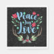 Deer antlers with "Peace Love Joy" text, red poinsettia, holly, berries, and snowflakes on black background.
