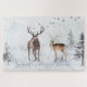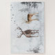 Watercolors illustration Christmas deer in a winter landscape with text- greeting of the season. Trees and flying birds in the background.