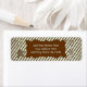 Blue and brown diagonal striped return address labels with two tree ornaments, a brown banner where you can add your name and address, and a background of blue and brown diagonal stripes.