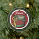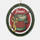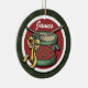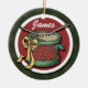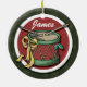 This Christmas ornament features red drum with a big gold bow on a red, white and green background.