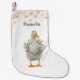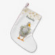 A festive holiday stocking with a white Christmas duck adorned with a holly wreath around his neck and gold snowflakes in the background. Personalize with your name.