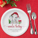 Christmas holiday season paper plates for your baby girl shower featuring "Santa Baby" in a stylish red script with swashes and a cute watercolor illustration of a baby girl elephant with a Santa hat, a red and green candy cane and presents. Add the mother-to-be's name and shower date in simple modern typography.