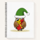 An illustration of a shy happy elf owl with green santa hat and red present with yellow ribbon. This cute cartoon design is a gift idea for owl lovers, bird lovers, and fantasy or magical movie lovers. Are you excited to receive your gift on Christmas?
