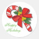 Pretty decorative holiday stickers, with graphics of a decorated candy cane made to look like embroidery. Happy Holidays in green script text is fully customizable to read what you want. Great for use as envelope seals to your holiday greeting cards and invitations.