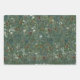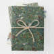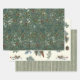 A wrapping paper set for nature lovers. The first wrapping paper sheet is a collage of dense evergreen branches which includes pine, spruce, yew, fir, and juniper needles. The second paper is interspersed with evergreen branches and pinecones, with a chickadee songbird perched on a snowy branch. Finally, the third paper has vintage green stripes.