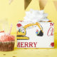 A cute illustration of a yellow toy excavator wearing a Santa hat and decorated in Christmas lights digging up some Christmas gifts with words "Merry Christmas". Perfect for construction truck lovers of all ages. An ideal Christmas wrapping paper for excavator truck enthusiasts big or small, girls or boys.