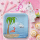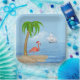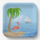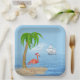 Pink flamingo with Santa cap and Christmas palm tree in beach sand with boat and ocean water.