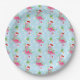 Pink Christmas flamingos wearing string lights and a Santa hat on a pastel blue background with snowflakes and festively decorated palm trees. Shown here on customizable paper party plates. You can easily resize the pattern to your preference and select your favorite background color. It's a cute pattern for celebrating Christmas with a tropical vibe!