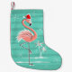 Stylish design with a retro touch featuring a festive pink flamingo wearing a red Santa hat, stars and palm trees decorated with baubles set against a striped aqua background. A customizable design for you to personalise with your own text, images and ideas. An original digital art image created by Quirky Chic.