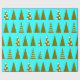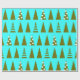A modern pattern of white geometric trees, some with snow white ornaments...all on an aqua blue background.
