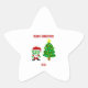 Here you can admire one of Christmas drawings, I call, "Christmas FrankenCheese," FrankenCheese dressed up as Santa, with a decorated Christmas tree, text says, "Merry Christmas." You can now order, "Christmas FrankenCheese," on this star sticker to wish someone a, Merry Christmas."