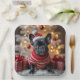 A black French bulldog in a red and white striped sweater and Santa hat sits on a white fur rug.