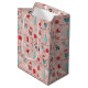 Gift bag with whimsical holiday design featuring Santa cupcakes, snowmen, gift boxes, string lights, and snowflakes on a soft pink background.