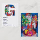 G initial alphabet letter ,whimsical, artistic monogram design.Acrylic painting with green floral ornaments,winter plants, holly berries toys ,gifts and balloons.in red blue yellow white colors by Bulgan Lumini (c)