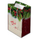 Christmas holiday gift bag shown in beige toped on front and back with a bough of evergreen with berries and pine cones; and red and black buffalo plaid print design on the sides.