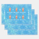 Modern Christmas gift wrap for kids, with a minimalist design that includes a gingerbread figure of Santa, snowflakes, the greeting "Merry Christmas" in stylish typography, and a personalized name. On a blue background with snowflakes.