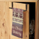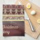 On this festive kitchen towel are rows of gingerbread cookies on a burgandy lacy backdrop with personalization at the top of the design with added sparkle for extra glam. Fun cheery christmas theme for baking in the kitchen