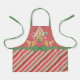 Great color and even though I ordered the kid size, it covers well enough to use during the holidays. I am not a big woman and prefer a shorter apron. I stand 5"6" and the length of the garment goes to mid-thigh. The tie straps fit well at my waist and even though there is no neck strap adjustment, the opening is plenty big enough. I am happy with the size and fit. I am sharing my apron with my 10 year old grandson, too! The color is vibrant and looks good, as shown on the website. The stitching looks strong and reinforced. Photographed is front side and back side of the apron, reinforced straps and coloring. My phone camera may not be the best at showing the details.