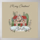 Christmas Gingerbread House Bird Winter Poster. Cozy digital illustration featuring a whimsical Christmas gingerbread house with white icing and a candy cane chimney, nestled among stylized snowy pine trees and holly berries. A charming little yellow and brown winter bird rests on a decorative snowdrift below. This festive artwork, with its fairytale storybook style, is perfect for holiday cards, winter graphic design projects, seasonal apparel, or as a joyful web background. Bring a touch of winter wonderland magic to your next creative endeavor."