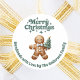 Perfect for homemade cookies, bakery goods. A white background, green text. Merry Christmas is written with a retro style font. Decorated with a gingerbread man holding a Christmas tree. Personalize and add your family