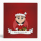 Design with an illustration of a cute smiling happy girl with short black hair, she is wearing red and white Santa Claus costume and holding a present; with editable text template for your name or message, Christmas holidays design with a red background