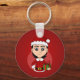Design with an illustration of a cute smiling happy girl with short black hair, she is wearing red and white Santa Claus costume and holding a present; Christmas holidays design with a red background