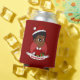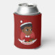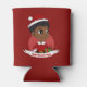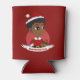 Can cooler with an illustration of a cute smiling African American girl with an Afro hairstyle, the girl is wearing a Santa Clause costume with a red hat and holding a present; in a red circle on a red background, with an editable text template for your name or message