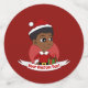 Table confetti with an illustration of a cute smiling African American girl with an Afro hairstyle, the girl is wearing a Santa Clause costume with a red hat and holding a present; in a red circle on a red background, with an editable text template for your name or message