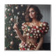 A stunning brunette woman exudes holiday cheer in a unique, eye-catching dress adorned with shimmering gold fabric and a cascade of colorful Christmas ornaments. Holding a champagne flute with a delicate hand, she stands confidently before a brightly lit Christmas tree, her captivating gaze meeting the viewer's eye.