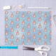 Christmas Gnome with Presents Tree Personalized Gift Wrapping Supplies. This fun watercolor Scandinavian gnome holding a present and sitting in front of a Christmas tree, is a festive way to wrap your holiday presents this year. The text can be personalized and the design is on a blue snowflake background.
