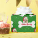 Santa Claus hat on a cute golden retriever with dog bone, snowflakes, glowing holiday lights, and Season's Greetings text.