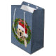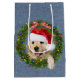 Cute golden retriever dog in Christmas pine wreath with gingham bow and glowing light string.