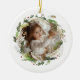 This elegant Christmas ceramic ornament features a delicate watercolor wreath of greenery, soft foliage, and subtle red berries encircling a customizable photo, adding a personal touch to your holiday decor. The "Merry Christmas" greeting is printed in an elegant serif font, with options to add a family name and year, making it a cherished keepsake or thoughtful gift for loved ones. Perfect for decorating the tree or adding a festive touch to your home, this ornament brings warmth, style, and holiday cheer to your seasonal decorations.