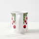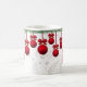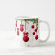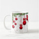 Red dangling Christmas ornaments, suspended from a swag of conifer boughs and holly sprigs, superimposed on a background of light-colored foliage drawings, makes a beautiful Mug for the holidays!