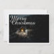 The card shows an atmospheric, wintry scene with a small, illuminated wooden hut in the middle of a snow-covered forest. The warm light source inside creates a beautiful contrast to the dark, peaceful surroundings. The elegant "Merry Christmas" lettering in white gives the motif a festive touch. 🎄✨